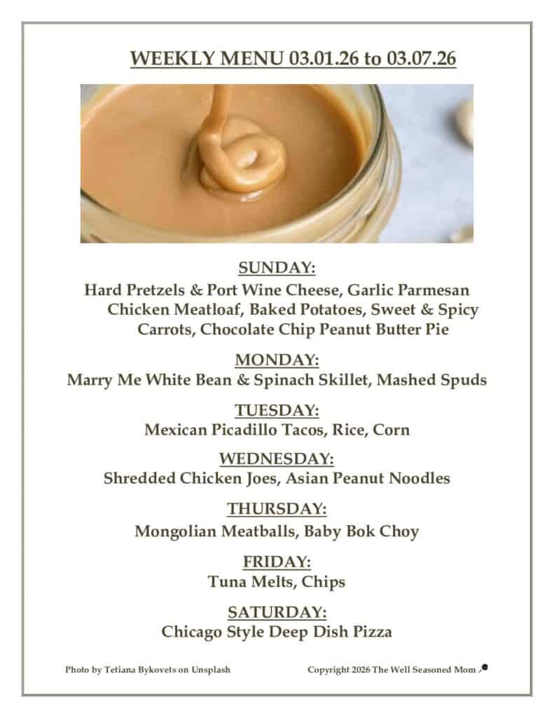 What made the cut during the Weekly Menu 03.01.26? I was leaning towards the Chocolate Chunk Cookies, but that recipe calls for almost a pound of premium chocolate, and the price on that has been through the roof! We’re opting for a mini-chocolate chip-laced Peanut Butter Pie. It’s comforting, and the peanut butter is super mild with the addition of the cream cheese. And I can usually stop at a sliver, which does NOT happen with the cookies. I could make the cookies with a bag of chocolate chips. Maybe I’ll do that later in the week.