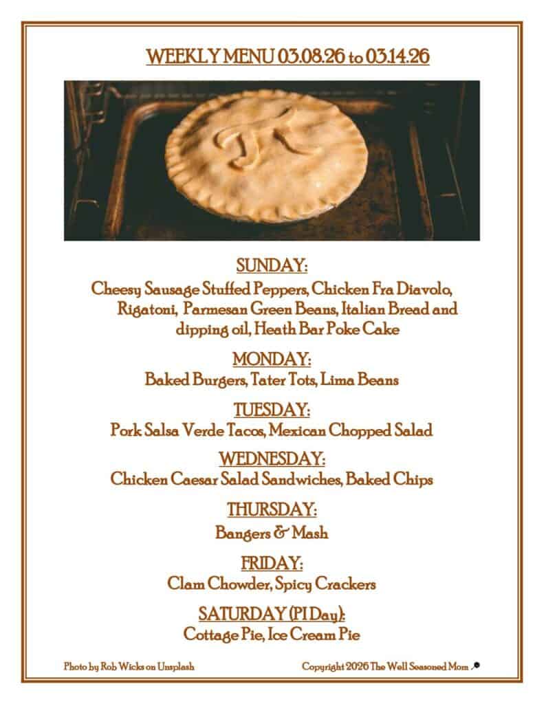 Weekly Menu 03.08.26: The One Where Dinner Meets Pi (and Probably Pie too!) Every year around this time, the math world gets a little excited about Pi Day, celebrated on March 14 (3.14… get it?). Pi is the mathematical constant used to calculate the circumference of a circle, and it goes on forever without repeating. Honestly, that sounds a lot like the mental math moms do every single day, trying to figure out what to make for dinner.