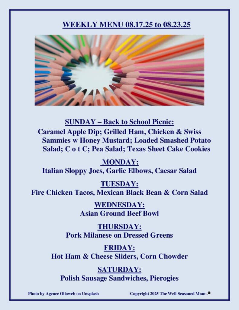 The Weekly Menu 08.17.25 pays homage to all returning to school (and those who have already done so). Even though we don’t have anyone heading back into the classroom except my favorite DIL, we’re down to party. She is going back to school, but not as a student. She’s a fourth-grade teacher. Our big news is that her name is different than it was last year, because she got married (to the OG Baby Boy) in June. Her new name is on her classroom door – which we saw a picture of. That’s as close as the rest of us are getting to school.