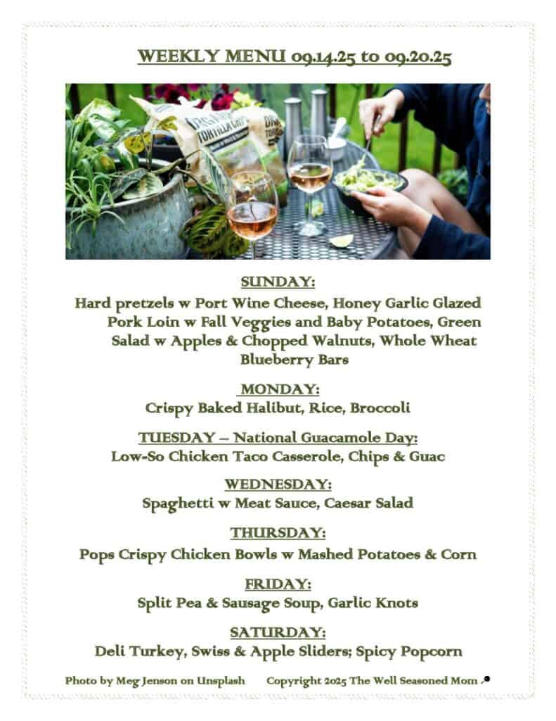 So, what’s for eats during the Weekly Menu 09.14.25? We’re keeping it low-key healthy, and watching our sodium when we can. Sunday dinner is a garlic honey roast pork that is a crowd pleaser as well as a Mom pleaser – it’s a one pan dish that roasts the veggies, potatoes and meat all together. It tastes great too!